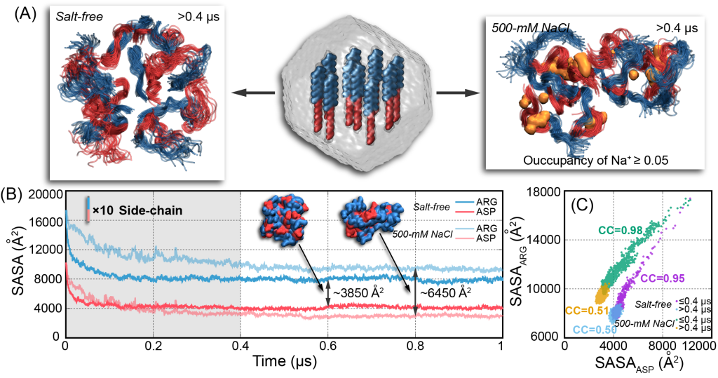 液液相分离(LLPS)是生物大分子在真核细胞中聚集形成无膜细胞器的基础,也是细胞区域化的重要机制,展现了真核细胞对各种生理活动的精准、动态的时空调控。当前,如何建立相分离现象和生物学功能之间的关系是该领域内的重要科学问题。当生物大分子的含量超过一定临界浓度时,分子会自发凝聚形成新的液相,即发生液-液相分离。固有无序蛋白(IDPs)通常富含带电侧链的氨基酸,因此涉及其侧链之间相互作用的LLPS引起了学界极大的兴趣。然而,关于这类带电IDPs在盐溶液中凝聚的分子细节仍然缺乏研究。在此,该团队聚焦于两种极端排列的带对立电荷氨基酸的肽链,研究了它们在不同离子环境中的凝聚模式。结果表明,电荷排列序列不均匀的肽链之间的相互作用模式对周围的阳离子环境更为敏感,与镁离子相比,钠离子更容易引起天冬氨酸侧链的凝聚。随着钠离子浓度的增加,带对立电荷的残基侧链之间的静电相互作用逐渐转化为由钠离子桥接的负负氨基酸相互作用网络,而富含正电荷的区域则更倾向于暴露在溶剂环境中,获得更大的运动自由度。同时,这种效应会随着盐浓度的进一步增加而达到饱和。本研究丰富了人们对原子层面相分离现象中静电主导因素的认识,希望能对未来针对性LLPS的设计和应用有所启发。