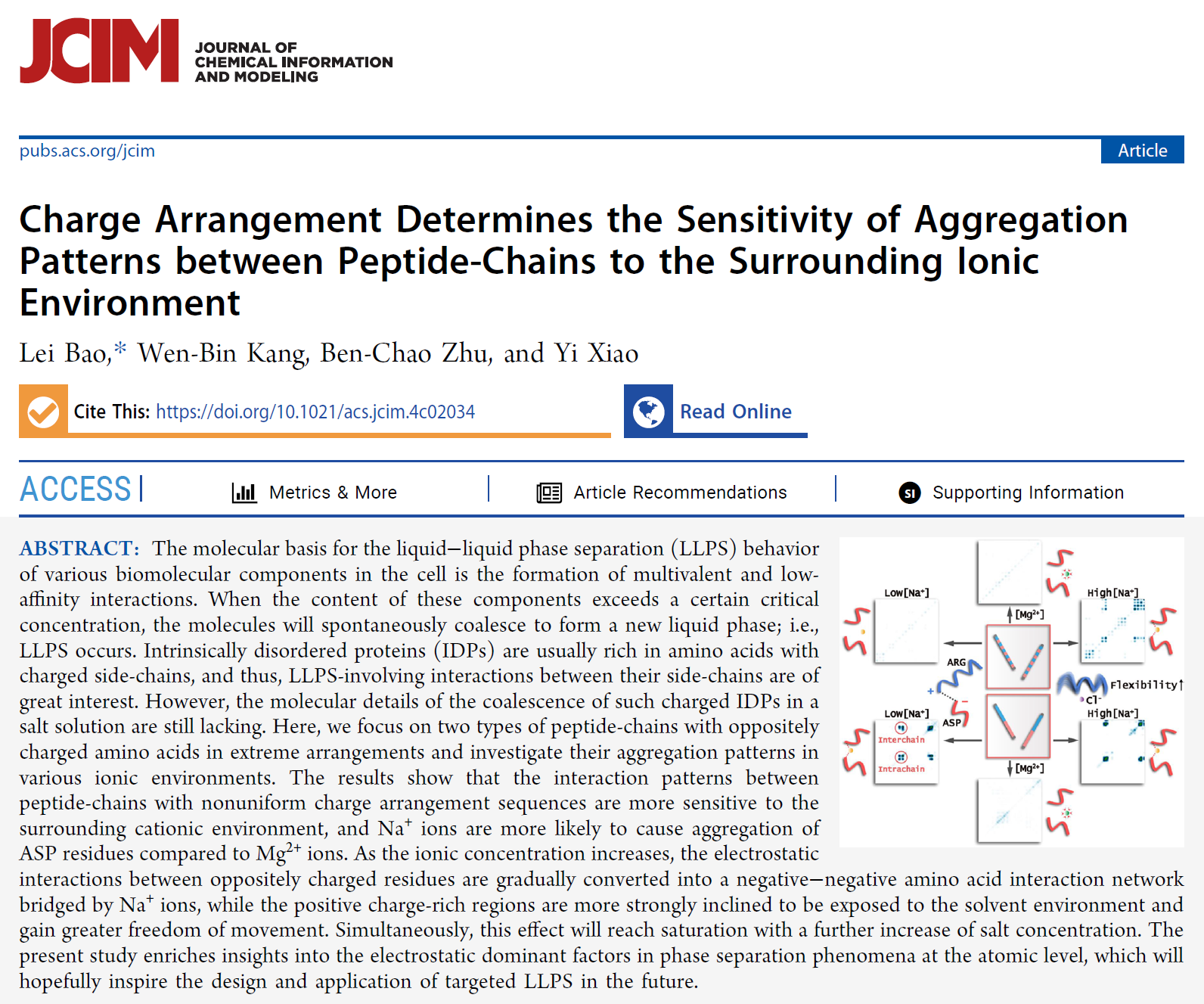 本网讯(通讯员 黄晶晶)1月7日,美国化学会期刊Journal of Chemical Information and Modeling(JCIM,中科院化学二区top,5年IF:5.9)在线刊发英国上市公司官网365生物物理团队最新研究成果“Charge Arrangement Determines the Sensitivity of Aggregation Patterns between Peptide-Chains to the Surrounding Ionic Environment”。JCIM创刊于1961年,是美国化学会旗下专注于化学信息学和计算模拟研究的国际权威学术期刊。过去60余年,JCIM见证了化学、生物学和计算机科学交叉的新兴学科领域的诞生和发展,发表了众多在药物设计和化学信息学领域具有重要影响力的科学研究成果。