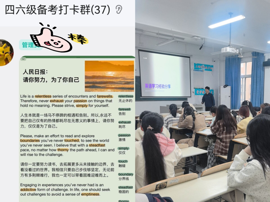 本次活动的核心环节,是特邀班级学习委员、英语成绩优异的李明鹞同学进行经验分享。李明鹞同学基于其成功的备考经历,为全班同学带来了一场“干货”满满的分享。他从真题剖析、时间管理、技巧速递三个维度展开,针对听力“抓关键”、阅读“寻主旨”、写作“搭框架”、翻译“破难点”等具体题型,提供了极具操作性的策略。此外,他推荐了亲测有效的学习工具与资源。同学们全程凝神聆听,并在互动环节踊跃提问,现场气氛热烈。为将分享会的短期效益转化为长期动力,班级正式创建了“四六级备考学习群”。此群将作为专属的线上互助平台,鼓励同学们每日打卡、随时分享优质学习资料、交流备考心得、组队练习并相互督促,真正实现资源共享与经验增值。